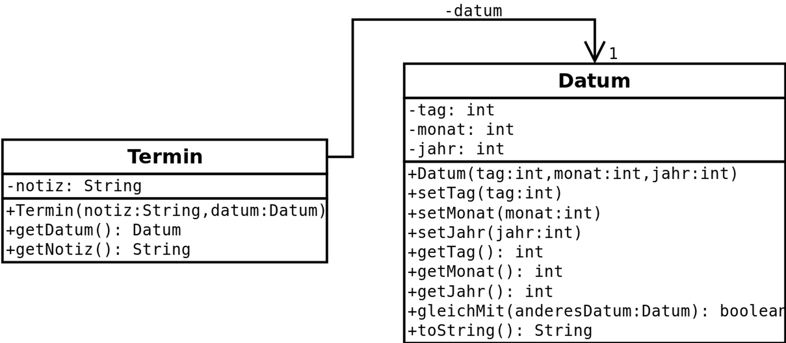 Das Klassendiagramm beschreibt die beiden Klassen Termin und Datum mit ihren Attributen und Methoden und einer Assoziation ("kennt-Beziehung") von Klasse zu Termin.